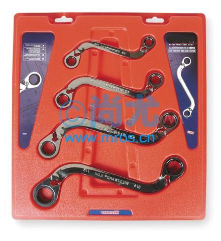 4件套英制S形可换向棘轮梅花扳手组套;铬钒钢制造,表面镀铬;规格(inch):3/8 x 7/16, 1/2 x 9/16, 5/8 x 11/16, 3/4 x 7/8;品牌:美国